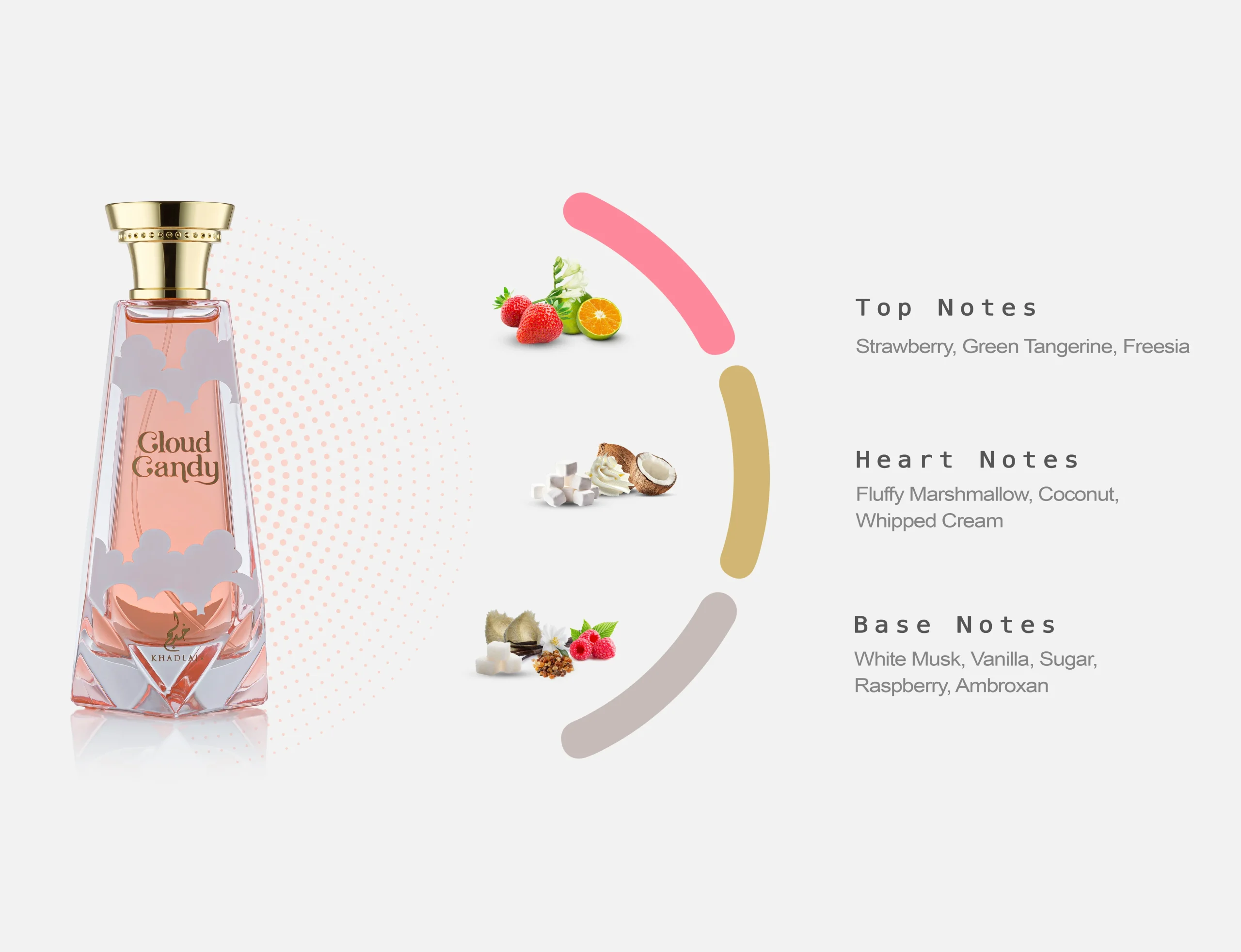 Experience a dreamy indulgence with Cloud Candy by Khadlaj Perfumes – an Extrait De Parfum crafted. Discover the best marshmallow candy-sweet fragrance that blushes beautifully on a woman’s skin. Cloud Candy by Khadlaj Perfumes is an irresistible Extrait De Parfum designed for those who love playful, feminine scents. It opens with juicy notes of strawberry and tangerine, melts into a heart of fluffy marshmallow and creamy coconut, and finishes with a warm base of musk, vanilla, sugar, and ambroxan.